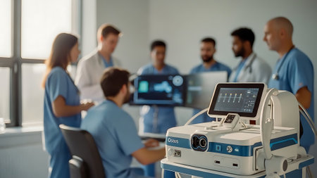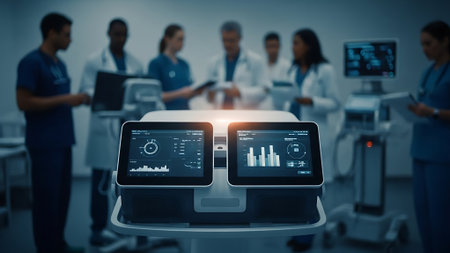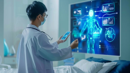 Medical team monitoring patient vitals using futuristic technology in hospital room
