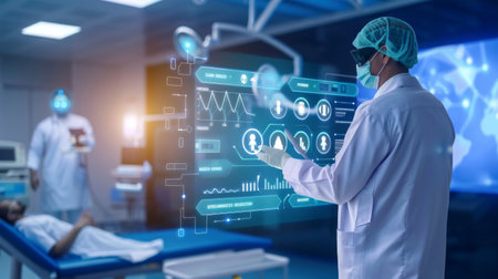 Doctors and Artificial intelligence (AI) illustrations with holographic graphic overlays. These images demonstrate the integration of AI technology into various medical procedures.