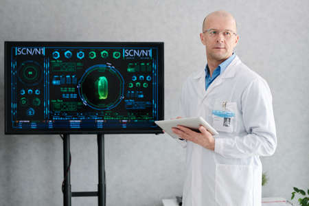 Serious mature doctor in white coat standing near the big display and using tablet pc during conference