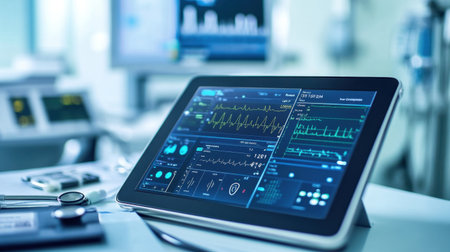 Digital tablet showcasing real-time patient monitoring data in a modern healthcare environment, emphasizing advanced technology and medical insights for better patient care.