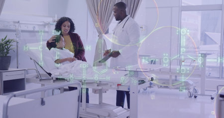 Microprocessor connections against asian male doctor talking to caucasian boy at hospital. Medical healthcare and technology concept