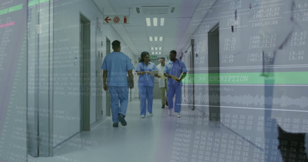 Medical team in uniforms reviewing tablet and clipboard in hospital corridor with binary overlay. Medical professionals, healthcare, analytics, futuristic, technology, collaboration, innovation
