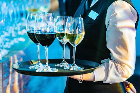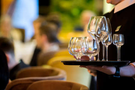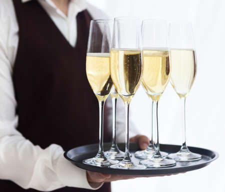 Shallow depth of field (selective focus) details with a waiter walking around and giving sparkling wine to the guests of an event.