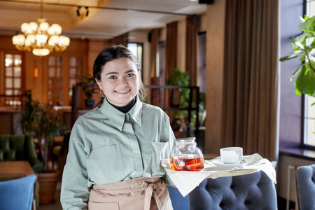 Waitress with smoothies on a tray in a stylish eatery offering friendly service and a cozy vibe