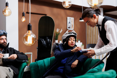 Asian girlfriend paying with credit card while boyfriend holds cup of coffee seated in ski mountain resort. Young waiter serves couple in winter clothing with pos terminal for payment in hotel lobby.
