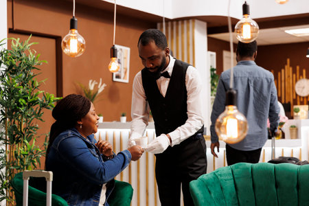 Hotel porter serving woman with coffee, giving beverage to hotel manager at reception. Administrator sitting in lounge area at resort, receiving drink from bellboy with professionalism.