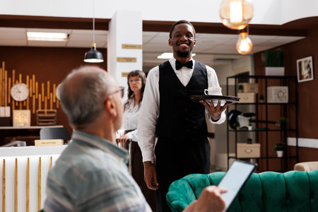 In luxury hotel lobby, african american waiter serves coffee to elderly gentleman visitor using digital tablet. In lounge area, retired senior guy holds device and accepts a cup of tea from employee.