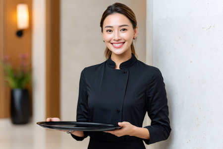 Young Asian woman smiling in uniform, holding an empty serving tray