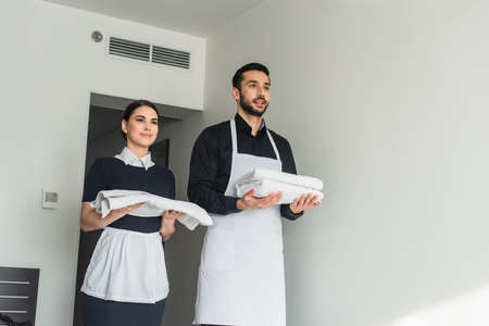 cheerful housekeepers holding white bed sheets and towels in hotel room