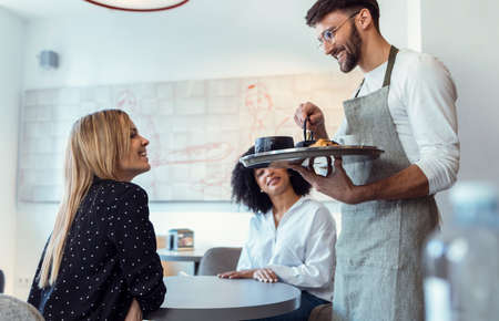 Shot of handsome waitress man serving coffee and pastry for smiling women at table in a pastry shop.