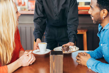 Horizontal medium section shot of young man working in cafe bringing coffee and dessert ordered to customer