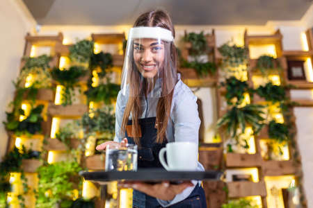 Female waitress wearing face shield, visor serves the coffee in restaurant during coronavirus pandemic representing new normal concept
