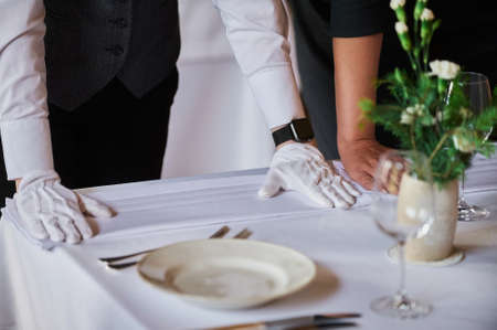 Close-up of waitress setting the table in the restaurant she putting the napkins on the table