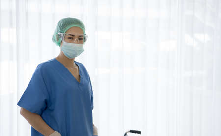 Asian female doctor or Nurse Wearing medical Protective Mask and glasses on face. Protection for Coronavirus COVID-19