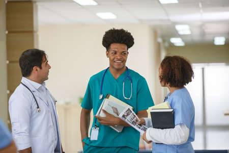 Diverse male doctors standing in hospital corridor and having discussion. medicine, health and healthcare services.