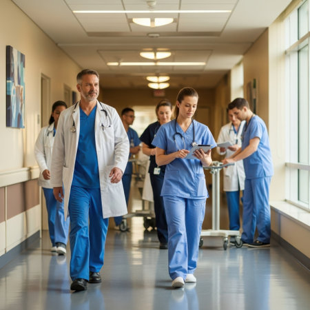 Group of healthcare professionals walking in a hospital corridor during a busy day