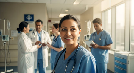 A smiling female nurse in blue scrubs and stethoscope stands in a hospital setting, surrounded by colleagues in similar attire, engaging with a patient in a calm and professional environment.