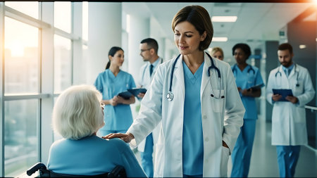 A diverse group of medical professionals, including doctors and nurses, interact with a patient in a wheelchair in a modern hospital lobby with large windows.