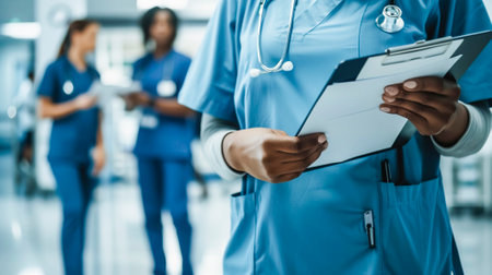 A dedicated young nurse in a uniform with a stethoscope, attentively reviewing patient medical records in a bright hospital setting.