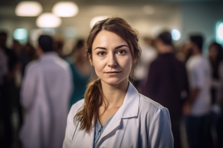 Portrait of young caucasian woman nurse or a doctor intern with colleagues. High quality photo