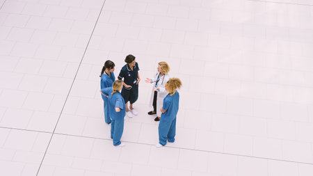 Overhead View Of Female Medical Staff Having Informal Meeting In Lobby Of Modern Hospital Building