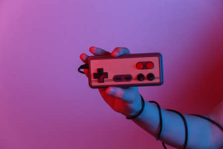 Hands holding retro joystick in blue-red neon gradient light. old gaming. 80s retro wave. minimalism