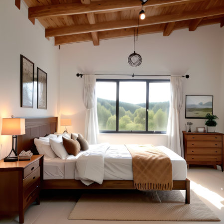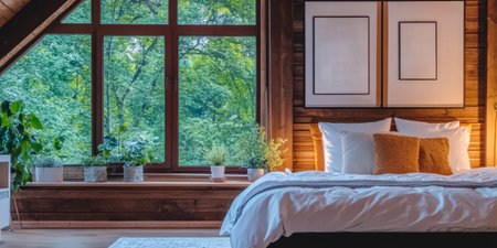 The warm and inviting bedroom features a comfortable bed adorned with pillows large windows framing a view of vibrant trees and soft lighting creating a serene atmosphere perfect for relaxation.