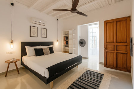 A bedroom with a black and white color scheme, featuring an elegant bed in the center of the room, white walls, a wooden door on the right side, a small fan on a table near the wall, a white bookshelf against the headboard, a modern pendant light hanging from the ceiling, and a clean, windowless floor. The overall ambiance is minimalistic yet inviting. --ar 3:2 --v 6.1 Job ID: e806f91e-83ab-49e6-9569-013d01ea09d4