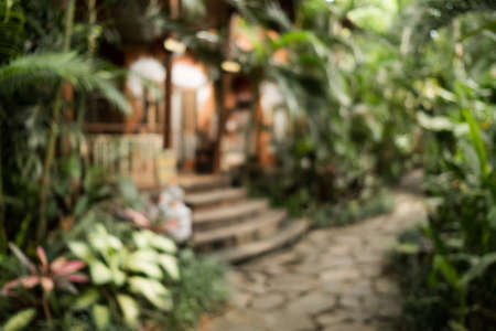 Ecological blured garden abstract concept. Beautiful garden in boken wita sone path and part of house. No focus shot.