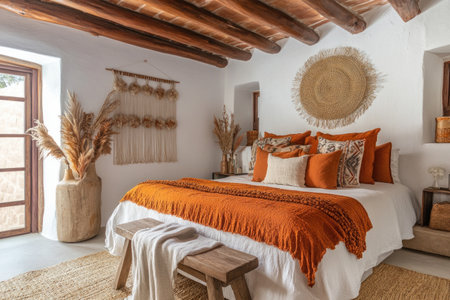 A bedroom with wooden accents, white walls, and a large bed adorned with orange pillows and blankets. A small bench is placed at the foot of the bed, surrounded by decorative vases holding dried flowers. The room has a minimalist aesthetic with a focus on natural materials like wood and fabric. There is an empty wall to one side that could be used for artwork or decoration. --ar 3:2 --v 6.1 Job ID: 149f0803-95ab-4be5-9fc9-1a74c7884379