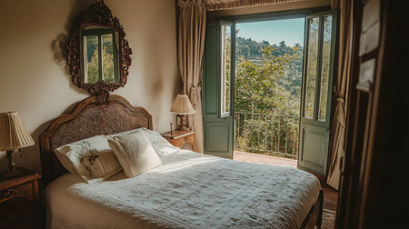 A peaceful bedroom setting with a beautiful view of nature perfect for relaxation and unwinding.