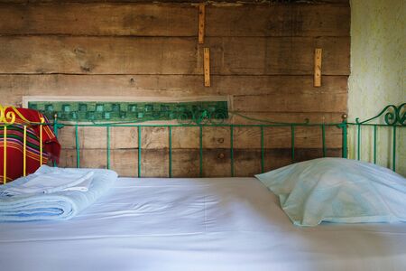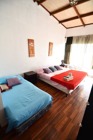 A Lanna-Style Wooden House Bedroom with a Teak Bed and Inviting Bright Bedding