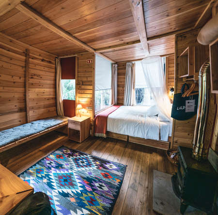 Horta, Faial Island - July 13, 2019: View towards beautiful Hotel room of Glamping Resort Azul Singular on Faial island, Horta, Auores Portugal. Photo taken in Azores, Portugal.
