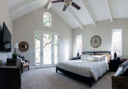 Panoramic view of newly built Ventura custom home with plenty of light into the vaulted ceiling bedroom on December 11, 2019 in Ventura, California, USA.