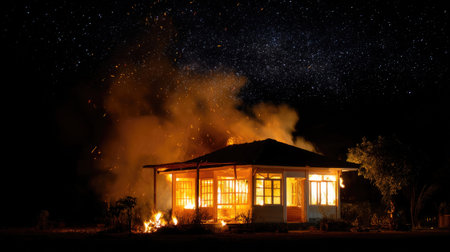 This striking image showcases a house engulfed in fierce flames, blazing brightly against a stunning starry sky, evoking a sense of chaos and urgency.