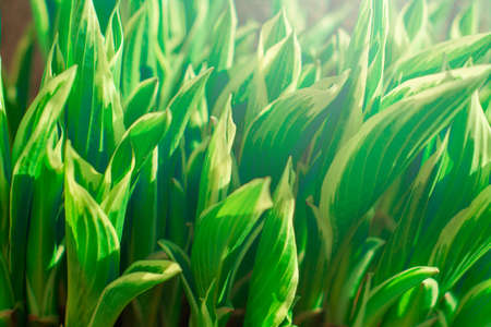 Beautiful floral background with bright green leaves of hosta (Hósta) in a flower garden