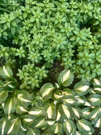 The hosta plant. Decorative form of popular flower, village park with flower beds