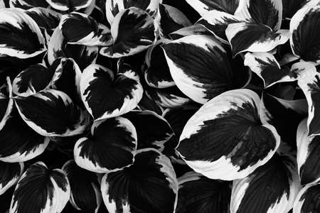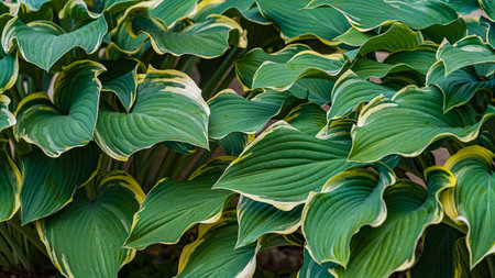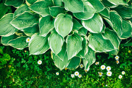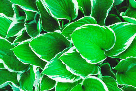 Green white leaves of hosta in garden close-up. Genus of perennial herbaceous plants of asparagus family. Shade-tolerant foliage in gardening and landscape design. Natural floral