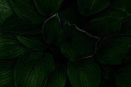 Fresh vibrant green leaves Hosta plant low key top view. Greenery background dark and moody style wallpaper screensaver. Dynamic backdrop. Botanical design, season gardening, natural flora environment