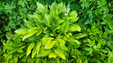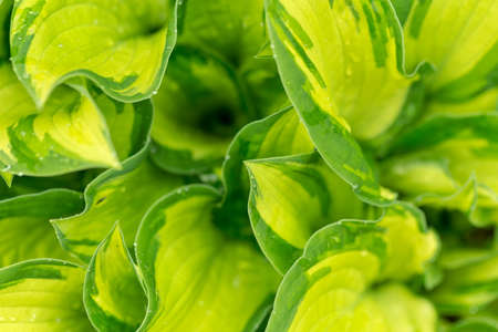 Bush of the cultivated hosta with variegated leaves with yellow center and green margins, top view in overcast weather close-up, background