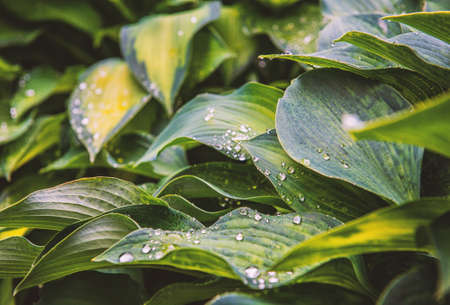 Green fresh hosta leaves with water drops. natural background
