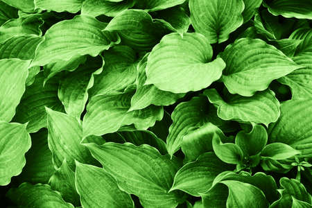 Minimalistic background with hosta leaves close - up view from above. The hosta leaves are a close-up of a bright green color. Beautiful large decorative leaves of an ever-green garden plant.