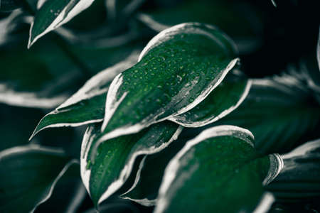 Fresh green leaves with rain drops texture, natural background, Decorative garden plant Hosta.