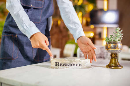 Restaurant reserved table sign. Interior of trendy cafe, copy space