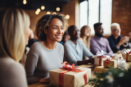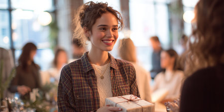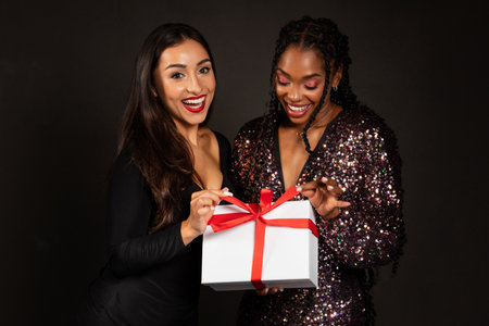 Mixed-race female best friends ready to exchange gifts during the holidays or birthdays. Smiling young women giving each other presents