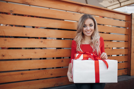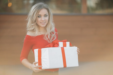 Pretty girl with long blonde hair, standing alone in the open air, holding a Christmas gift. Christmas woman with gift box.Cute young blonde in a white winter sweater with a red gift box, Christmas, New Year, Valentine's Day gift