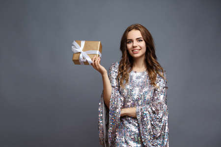 girl in a shiny New Years dress with a gift box with a heart. Birthday photo concept.
