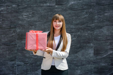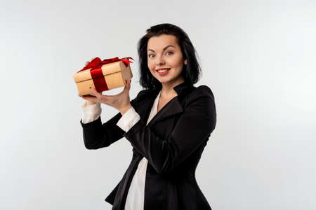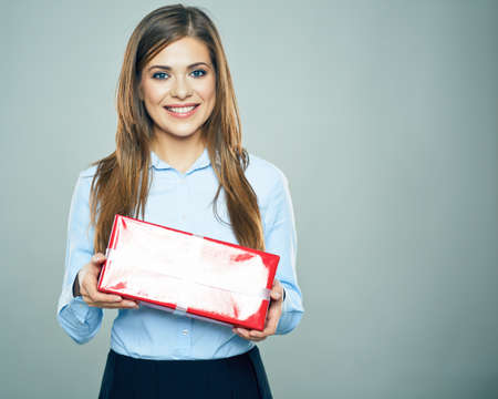 Happy woman hold red gift box. Business woman portrait isolated. Studio.