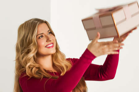 Holidays and celebration conception. Beautiful woman hold gift box in the studio.