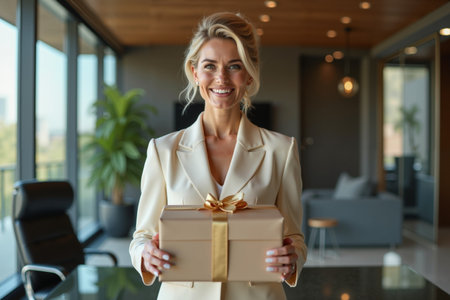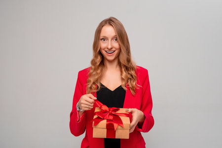 Beautiful happy young blonde woman in red formal suit jacket opening wrapped present. New Year Women's Day birthday holiday concept